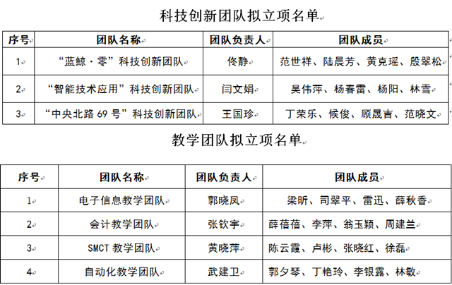 根据《拼搏平台科技创新团队建设管理办法(试行)》(南机电院[2016]38号)、《南京机电职业学院教学团队建设与管理办法(试行)》(南机电院[2016]37号)的有关规定,经校内公开申报、资格审查和专家评审,确定拼搏平台拟立项科技创新团队3个、教学团队4个,现予以公示,名单如下: