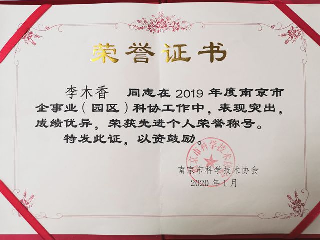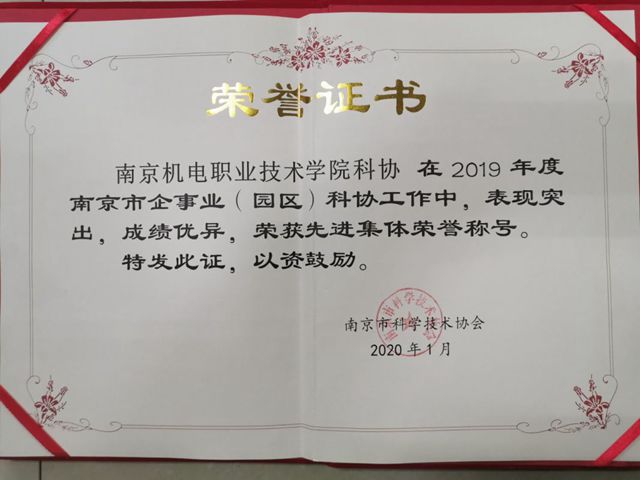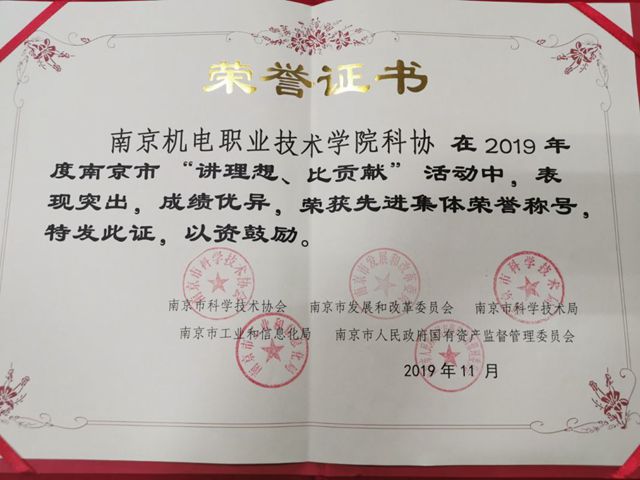 2020年1月3日,南京市科协十届四次全委(扩大)会议在南京科技馆召开,会上举行了首批“南京市企事业(园区)科技工作者之家示范基地授牌仪式。学院科协作为南京市唯一一家高校科协、全市四家科协之一获得“南京市企事业(园区)科技工作之家2019-2024年综合类示范基地”,学院副院长刁爱军代表学院接受了铜牌。同时,学院科协被评为2019年度市级企事业(园区)科协工作先进集体,学院科协秘书长李木香被评为2019年度市级企事业(园区)科协工作先进个人。