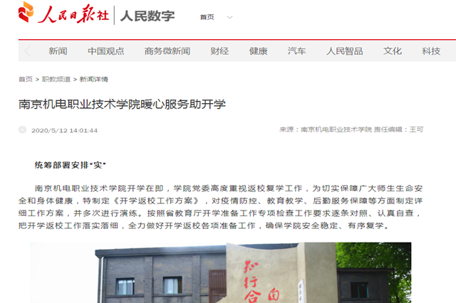近日,人民日报职教频道报道了我院暖心服务助力开学的相关举措,全文报道内容如下: