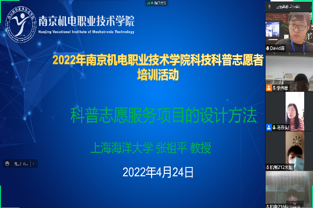 424日,为推动我校科技志愿服务规范化、制度化、常态化工作,有效发挥科技工作者之家的作用,我校科协邀请上海海洋大学教授、博士生导师张祖平老师为我校300名科技科普志愿者开展主题为科普志愿服务项目的设计方法的培训。