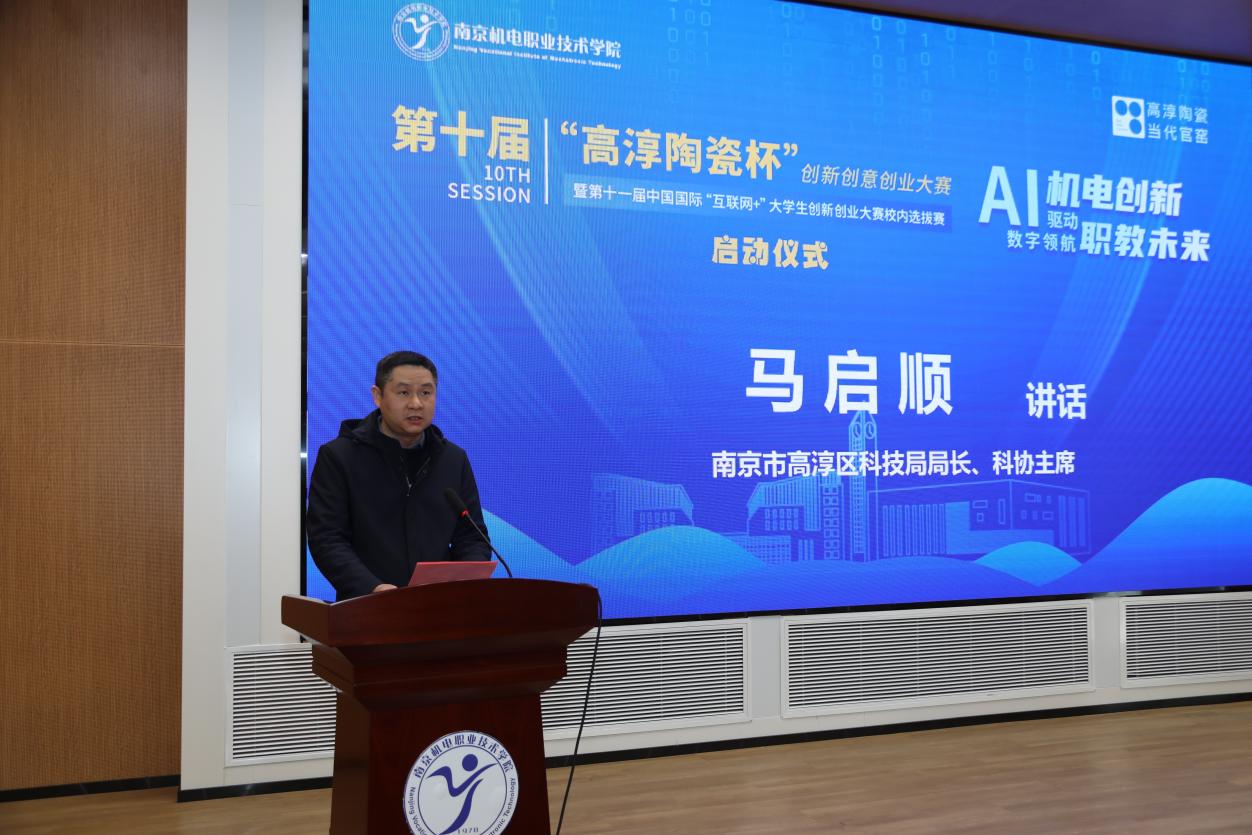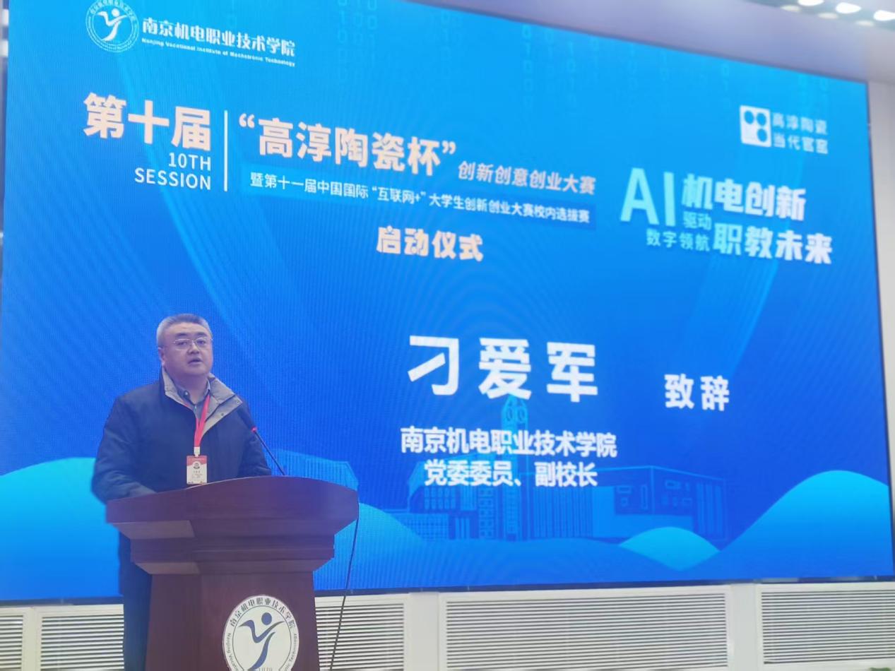 2025年3月18日,“AI驱动机电创新,数字领航职教未来”拼搏平台第十届“高淳陶瓷杯”创新创意创业大赛暨第十一届中国国际“互联网+”大学生创新创业大赛校内选拔赛启动仪式在乐学楼102报告厅举行。南京市高淳区科技局局长、科协主席马启顺,南京高淳高新技术产业开发区管理办公室分管负责人倪友谊,南京高等职业教育创新创业园发展服务中心主任吴凯,江苏高淳陶瓷股份有限公司党委副书记、副总经理周玉明,学校党委委员、副校长刁爱军等领导出席启动仪式。300余名师生代表参加活动,共同见证大赛开幕。