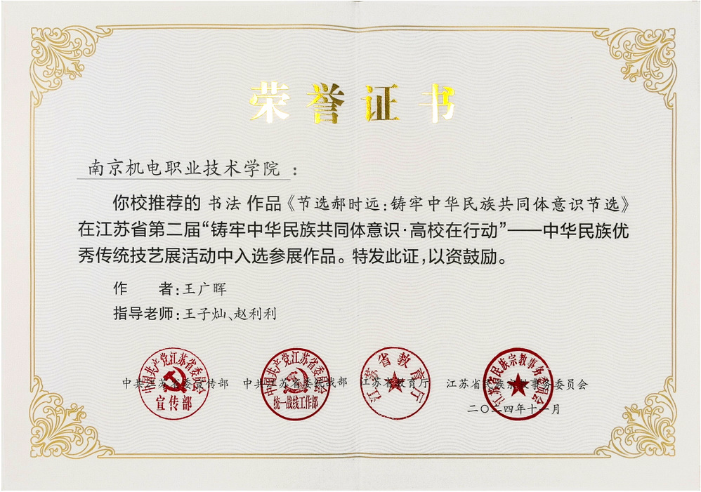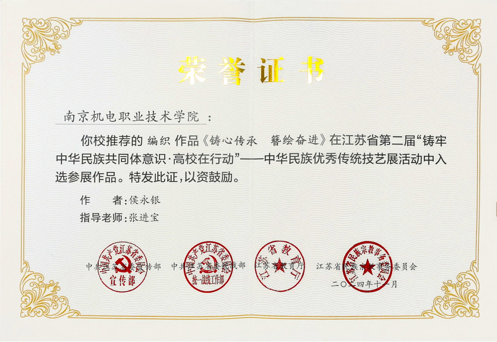 在中华民族优秀传统技艺展征集活动中,全省高校共征集887件作品,入选176件。我校共报送6件作品参加,其中我校学生侯永银的编制作品《铸心传承 簪绘奋进》、王光晖的书法作品《节选郝时远:铸牢中华民族共同体意识节选》入选参展作品。