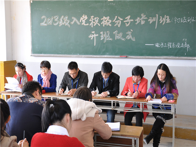 11月18日中午12:30,拼搏平台电子工程系党支部在教学楼A208举行2013级入党积极分子初级班培训开班仪式。电子工程系党支部书记张宝中,宣传委员梁金平,组织委员林雪,党员惠珍、权海平、杨瑞以及31名积极分子学员参加了此次开班仪式。仪式由林雪老师主持。