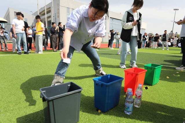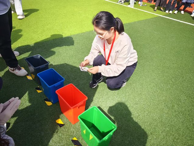 “争分夺秒——垃圾分类赛”结合环保热点,师生们在比赛中快速抽取垃圾卡片、准确分类投放,有效强化了垃圾分类知识,提升了快速决策与抗干扰能力。
