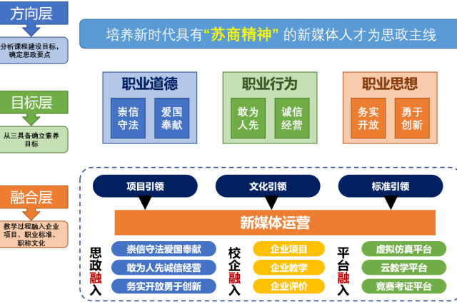 以培养新时代新媒体创新性技术技能人才为思政主线,在“三全育人”的探索实践中构建“三维度、三层次”的“苏商精神”课程思政育人体系。从职业道德、职业行为和职业思想三个维度对学生思想道德和政治素养培养。在课程内容中突出将岗位技能为指导的项目引领、企业文化为指导的文化引领、职业资格为指导的标准引领。坚持“以学生为中心”,突出“做中学,做中教”,解决了学生学习瓶颈、有效促进学生的学习积极性,激发学习兴趣,提升职业能力的培养。