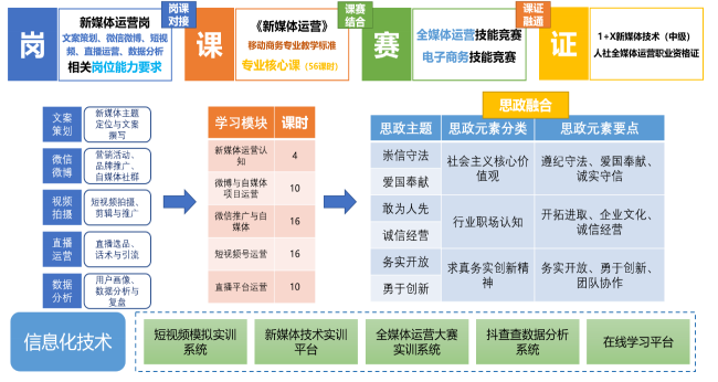 本课程以新媒体运营岗位专业技能为核心,教学内容对接企业真实任务,通过项目化实现课程学习由浅入深、由易到难,层层递进。课程教学标准对接职业技能标准,教学内容融入相关技能竞赛实践内容。以培养新时代创新型新媒体运营人才为目标,构建课程思政体系。目前课程是南京市课程思政示范课;校级精品课程。