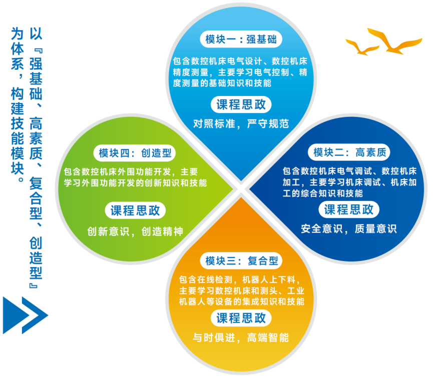 包含数控机床电气调试、数控机床加工,主要学习调试与维修、加工与测量的综合知识和技能。