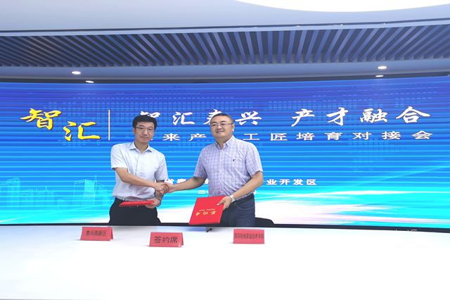 学院副院长刁爱军代表学院与江苏省泰兴高新技术产业开发区签订《产才融合战略合作协议》,学院党委书记、院长周庆礼向江苏省泰兴高新技术产业开发区授予“拼搏平台未来产业工匠培育基地”铜牌。