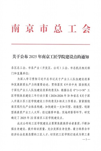 近日,南京市总工会印发了《关于公布2025年南京工匠学院建设点的通知》,学校成功入选2025年南京工匠学院建设点名单这一成果既是对学校多年来深耕产教融合的高度肯定,也为南京打造高素质产业工人队伍注入新动能。