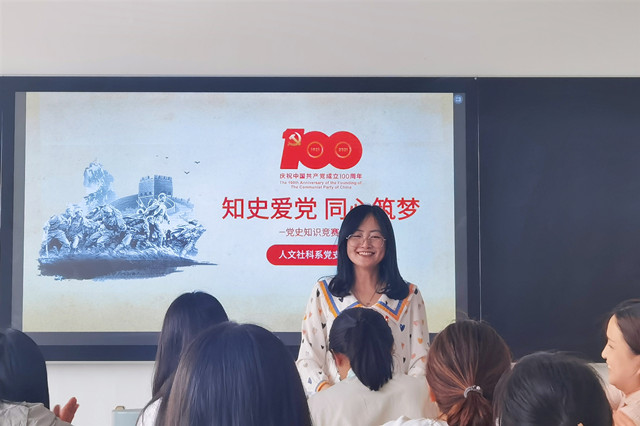 为深入学习贯彻习近平总书记在党史学习教育动员大会上的重要讲话精神,持续深入推动党史学习教育,庆祝中国共产党成立100周年,5月27日下午,人文社科系党支部在博学楼304举办了以党史知识竞答大赛的方式的举办了题为 “知史爱党,同心筑梦”的党日活动。本次活动由我系党支部副书记叶绘主持。人文社科系全体老师参与此次比赛。
