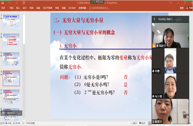10月26日下午1点30,数学教研室全体老师展开了第8周教研活动,会议由周建兰老师主持,主题是新学期教学内容讨论和线上教学心得体会。首先大家结合两周的线上上课情况对本学期的教学内容和重难点又进行了一次深入研讨,再一次得到一致意见,高职数学教学,要在保证科学性的基础上适当放弃严谨性,尽量通俗,直观,浅显易懂。