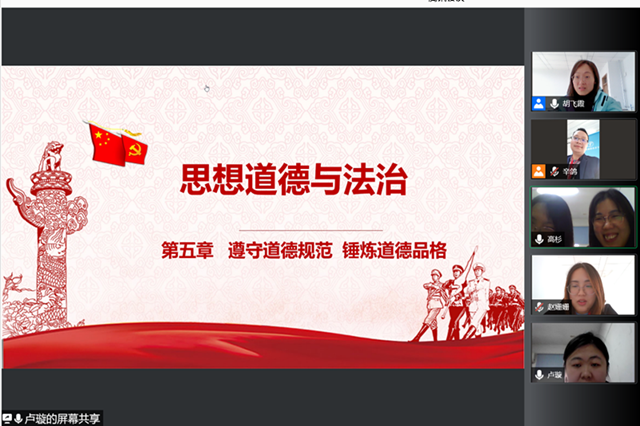 紧接着,卢老师以《思想道德与法治》第五章《遵守道德法则 锤炼道德品格》为例进行了一个完整的说课示范。她从教学方法、教学内容、案例分析、讨论等课堂设计,给参会教师们上了一堂生动活泼的德法课。
