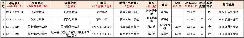 为规范教材建设与管理、做好教材编写、审核、选用等各项工作,提高教材建设水平,确保教材选用质量,依据教育部《职业院校教材管理办法》(教材【2019】3号)、教育部等5部门印发《关于教材工作责任追究的指导意见》和拼搏平台《教材建设与管理实施细则》(南机电院【2020】50号)等文件精神,现将2025年秋季(2025-2026学年第一学期)教材选用的结果(见下表)进行公示。