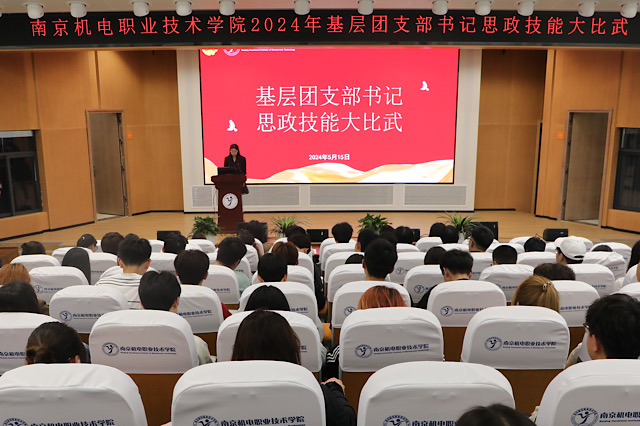 为贯彻落实党的二十大精神、团十九大精神,加强思想政治引领,深化理想信念教育,引导激励青年学生从党的百年历史中激发信仰、获得启迪、汲取力量,校团委于5月15日晚举行拼搏平台2024年基层团支部书记思政技能大比武。党委宣传部副部长张玥、党委工作部副部长高水冕、南京高职园团工委委员黄启睿和校团委副书记孙晓燕出席本次决赛。各系团委书记、团支部书记和全体青马班学员观摩了比赛。