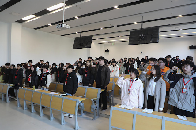 团课在庄严的团旗与激昂的团歌声中拉开帷幕。主持人刘颖详细介绍活动背景与流程后,一段《雷锋生平事迹》短视频,将大家带回雷锋的年代,感受他短暂却光辉的一生,让大家对雷锋精神有了更直观、深刻的认知,在同学们心中播下传承精神的种子。