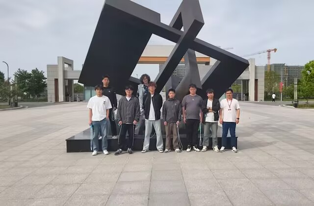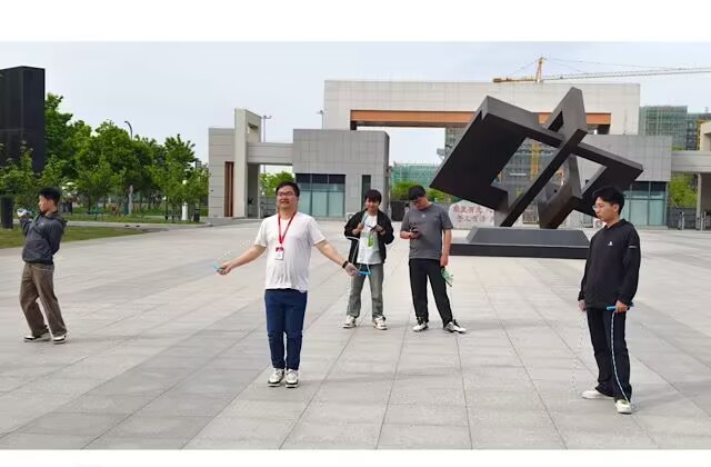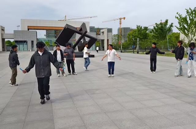 活动尾声,韦玉龙老师与全体社员共同完成了一段创意编跳绳表演。阳光下,九条彩绳如音符般跃动,师生们的身影与鲁班广场的青铜雕塑交相辉映,仿佛诉说着传统技艺与现代活力的碰撞。“希望更多人感受到跳绳的魅力,它不仅是运动,更是团队协作和坚持精神的载体。”韦玉龙老师向现场观众发出号召。