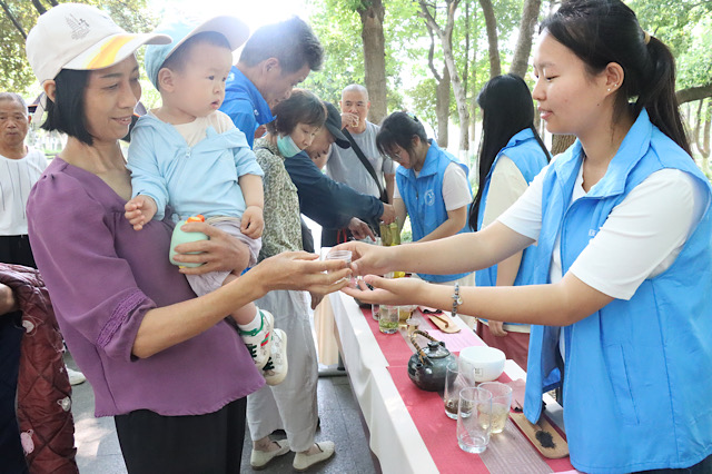 仪式上,志愿者将泡好的茶水倒入品茗杯,双手递给市民,热情地邀请他们品尝。市民们接过茶杯,轻抿一口,脸上露出满足的笑容,对志愿者们的专业服务赞不绝口。