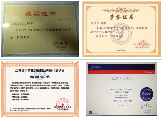 大学期间,专业成绩排名系部第二名,综合素质测评排名第一。在班级担任班长、院资助宣传大使,曾任拼搏平台单片机社团社长、蓝岛创客工坊学生负责人等。曾获得国家奖学金、国家励志奖学金、全国大学生挑战杯江苏赛区三等奖、中英STEAM江苏赛区最佳编程奖、江苏省大学生创新创业训练计划结项证书、学院奖学金、学院三好学生、学院优秀学生干部、学院优秀共青团员、社团之星、“一二九大合唱”二等奖、优秀标兵等荣誉称号。同时本人获得院优秀社会实践团队、优秀社会实践个人的荣誉称号、“欧帝杯”三创大赛优秀奖等。我所在班级在2018-2019学年被评为“江苏省省级优秀班集体”,“南京市五四红旗团支部”。