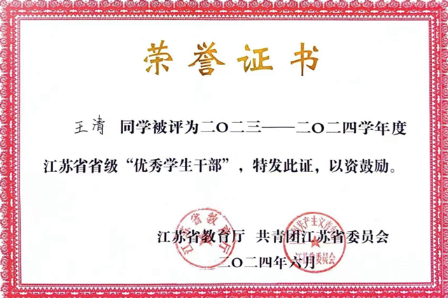 王清,女,预备党员,江苏泰州人,出生于20034月,2024年毕业于机械设计与制造专业,在校担任机械工程系学生会文宣部部长、班级学习委员、学校资助大使、学校支教社社长。