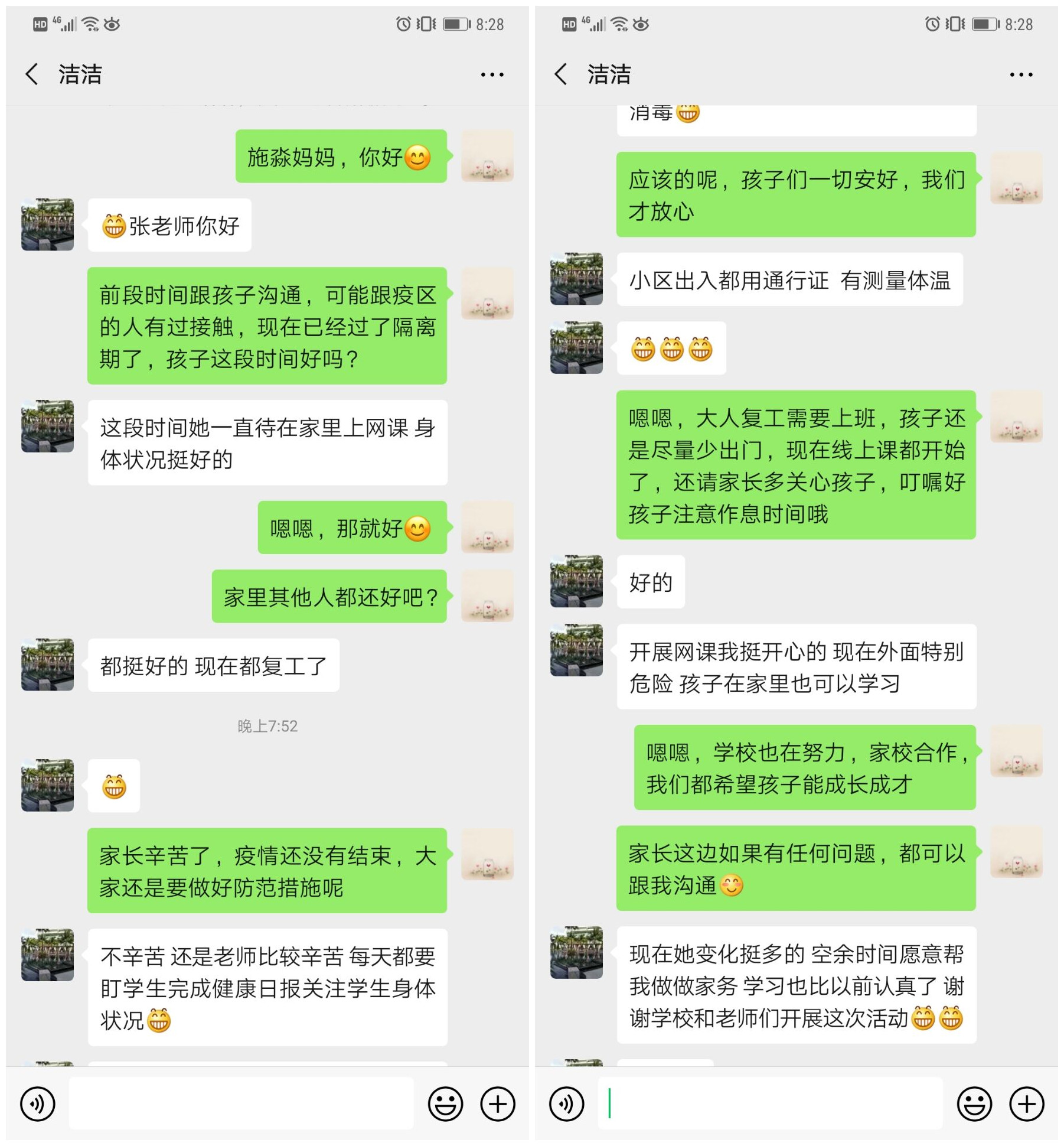 施淼同学是云计算191班的心理委员,在学校统计省厅疫情上报表的时候,施淼及时地将自己和确诊患者同一时间到访过大润发的消息反馈给了辅导员张婉佳老师,从2月10日开始,该生就开始居家隔离,在这段时间,张老师每天都保持着跟学生的联系,关注学生的日报情况,并积极与家长沟通,从上周起,学校开展了线上课,家长表示,之前孩子每天在家睡懒觉,最近一段时间,变化很大,每天坚持早睡早起,非常积极地上课,还学会了记笔记,家长对此表示非常欣慰。