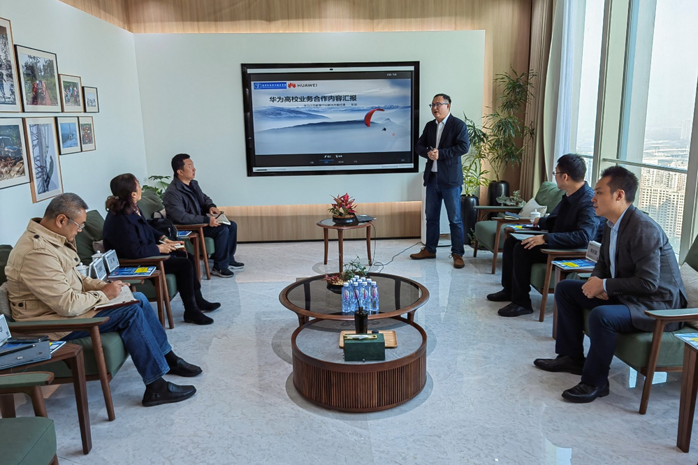 参观结束后,刁院长一行来到会议室与李总开展会谈,会议的开始由华为院校方案解决专家彭迪在人才生态和校企合作内容上向刁院长一行做了详细的介绍。在彭经理的介绍结束后,刁院长首先回顾了与华为技术有限公司进行校企合作的经历,随后刁院长表示华为作为ICT行业的龙头企业,不仅在核心技术研发上有着非常强大的实力,同时在人才生态的中也有一定的建树,深化校企合作,一方面有利于院校的人才培养,另一方面也为企业打造了人才池。