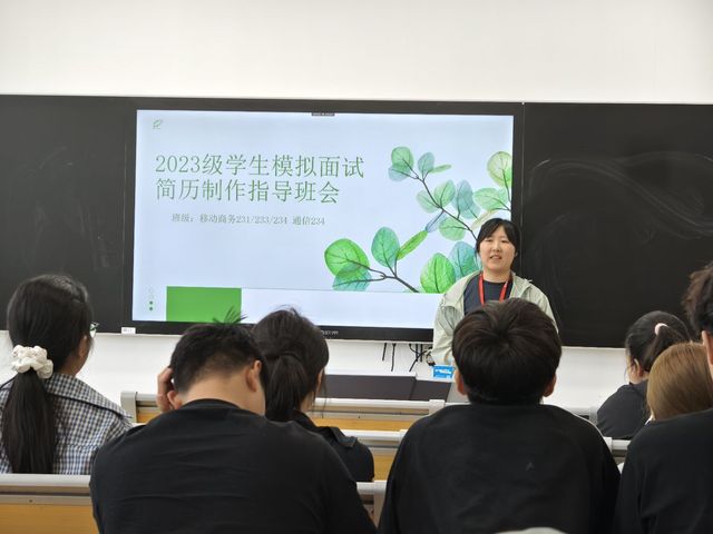 为助力2023级新生更好地应对即将到来的岗位实习,提升学生的求职技能,信息工程系党支部联合机关一党支部于5月开展了岗位实习系列班会,助力学生从容应对招聘会,将理论指导转化为实战演练,为学生搭建直通职场的桥梁。此次活动由党员老师下沉到各个班级,针对简历制作与面试技巧等关键内容进行深入指导,吸引了众多同学的积极参与。