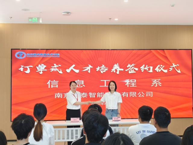 2025年6月10日,南京迎泰智能科技有限公司与信息工程系于弘毅楼一楼学生一站式社区举行订单式人才培养签约仪式。信息工程系党支部副书记陈雪、南京迎泰智能科技人力资源部总经理曹丽雅作为双方代表上台签约,移动商务学生代表共同见证这一重要时刻。此次合作标志着双方在深化产教融合、创新协同育人机制方面迈出实质性步伐,为智能科技领域应用型人才培养注入新动能。