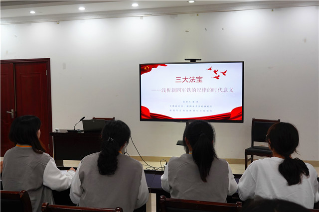 张会长以新四军军长陈毅总结的新四军抗战“三大法宝”为切入点详细阐释了新四军抗战过程中军队素养和战斗宗旨,让全体与会师生切实感受到新四军铁军精神激励人心、催人奋进的巨大感召力“战斗胜利是解决一切问题的枢纽”“模范守纪律”“同志间的团结”是陈毅军长总结的新四军抗战胜利的“三大法宝”。这“三大法宝”时至今日结合中国实际同样可以转化为我们个人发展国家强盛的“三大法宝”。