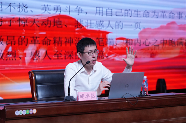 以诗为媒,以诗讲史,以红色诗词感受革命精神!雨花英烈研究会理事,中国作家协会会员胡卓然老师结合对应的历史背景,生动地给师生们讲述了邓中夏、谢文锦、朱克靖三位英雄事迹,用三位英烈的诗词深刻分析了他们为革命抛头颅洒热血所蕴含的爱国主义精神。雨花英烈无惧于牺牲个人利益和个人生命,以国家利益和民族安危为己任,这也是当代青年应该从雨花英烈的事迹里汲取的精神品质。