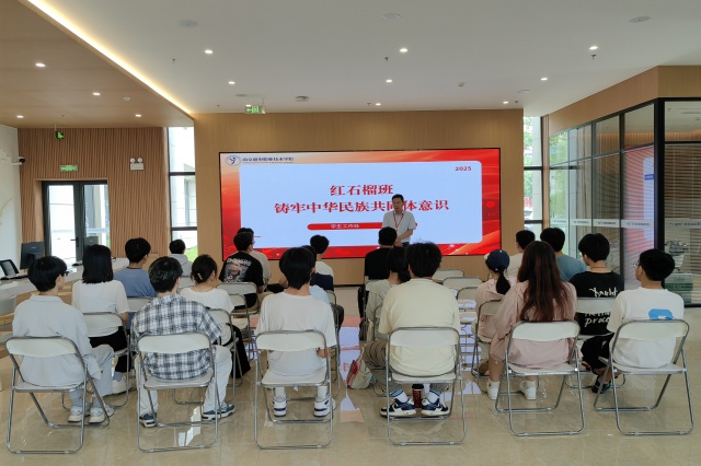 红石榴班辅导员钱莉娇老师围绕铸牢中华民族共同体意识应知应会知识做系统讲解。她通过深入的理论阐释,使在场同学深刻认识到民族团结是实现中华民族伟大复兴的基石,每一位同学都肩负着维护民族团结、传承民族文化的使命。钱老师特别强调,新时代青年要主动担当起促进民族团结、传承优秀民族文化的历史使命,让民族团结之花在校园绚丽绽放。