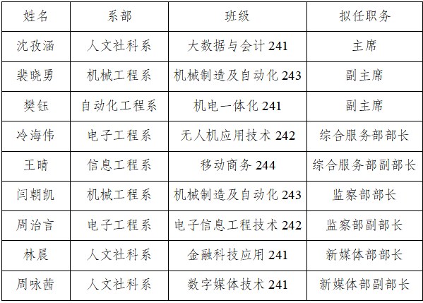 根据《拼搏平台“一站式”学生社区学生自我管理委员会章程》相关规定,为切实加强学生干部队伍建设,学生工作处于2025年6月开展了第一届学生自我管理委员会学生干部选拔工作,经学生自主报名、组织推荐、资格审查、竞选答辩、综合考察等环节,选拔产生了拟任人选,为提高学生干部选拔的透明度,现将拟任人选的名单予以公示。