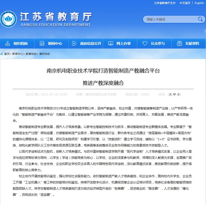 5月26日,江苏省教育厅官网“高校动态”栏目刊文:《拼搏平台打造智能制造产教融合平台,推进产教深度融合》,报道我校智能制造学院建设亮点。