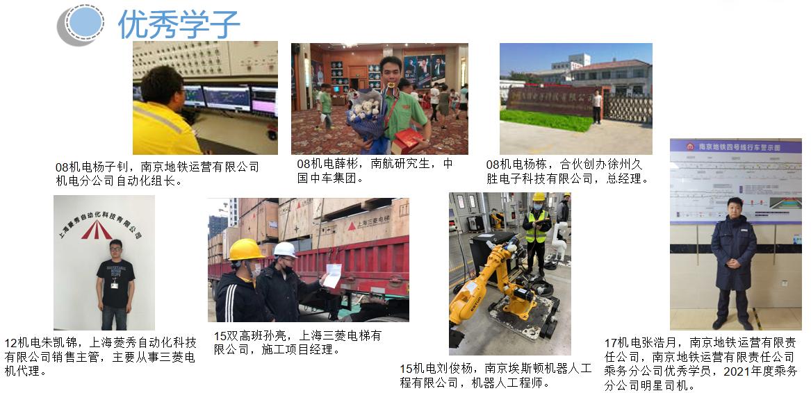 机电一体化技术班集体获评“江苏省先进班集体”“南京市五四红旗团支部”称号,学生荣获年度“中国大学生自强之星”称号,全国职业院校技能大赛“机器人系统集成应用技术”一等奖、江苏省职业院校技能大赛“机器人系统集成应用技术”二等奖、“江苏工匠”智能化系统集成应用“智能制造系统集成应用”赛项一等奖、二等奖、全国大学生机器人大赛ROBOTAC赛项二等奖、三等奖,江苏省大学生机器人大赛二等奖,华东区大学生CAD应用技能竞赛二等奖、三等奖等。近两年,学生申报专利近400项,授权专利近300项,机电一体化技术173班被《现代快报》“最牛发明班”专题报道。